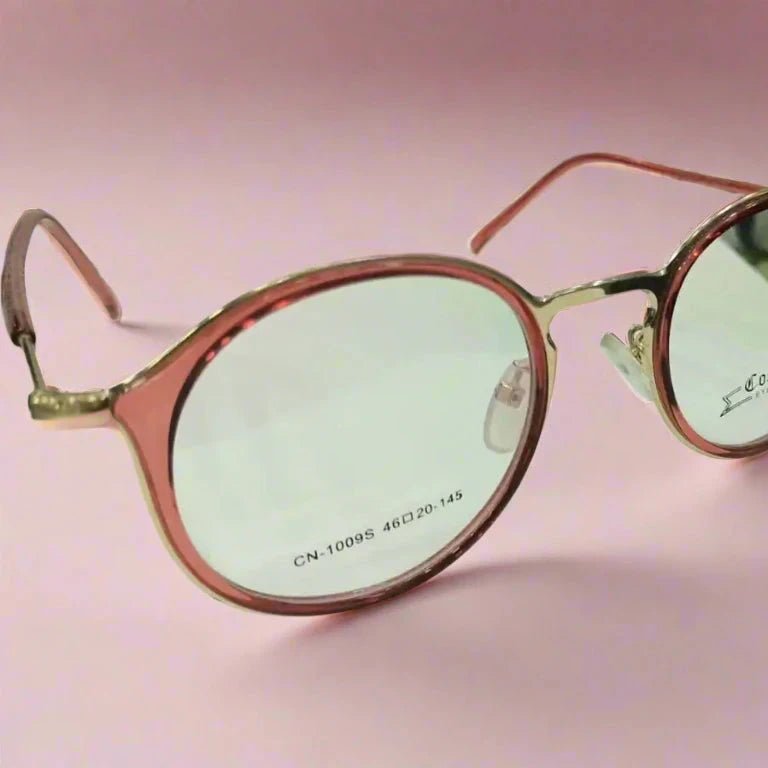 The glasses have a round frame design with a pinkish-red color combined with a gold-tone finish on the bridge and temples. It includes adjustable nose pads for better fit and comfort. The aesthetic style suggests they are lightweight and fashionable, possibly targeted at individuals seeking modern yet vintage-inspired eyewear.